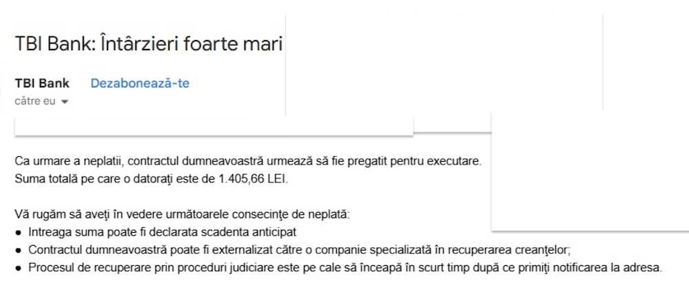 - In mesajul primit de la TBI sunteti amenintat (ceea ce este o ilegalitate) ca din cauza „intarzierilor foarte mari, contractul dumneavoastra urmeaza sa fie pregatit pentru executare”.